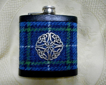 Celtic knot hip flask with blue, green and grey Harris Tweed , an ideal mens gift for christmas or birthday or a present for best man, usher or groomsman