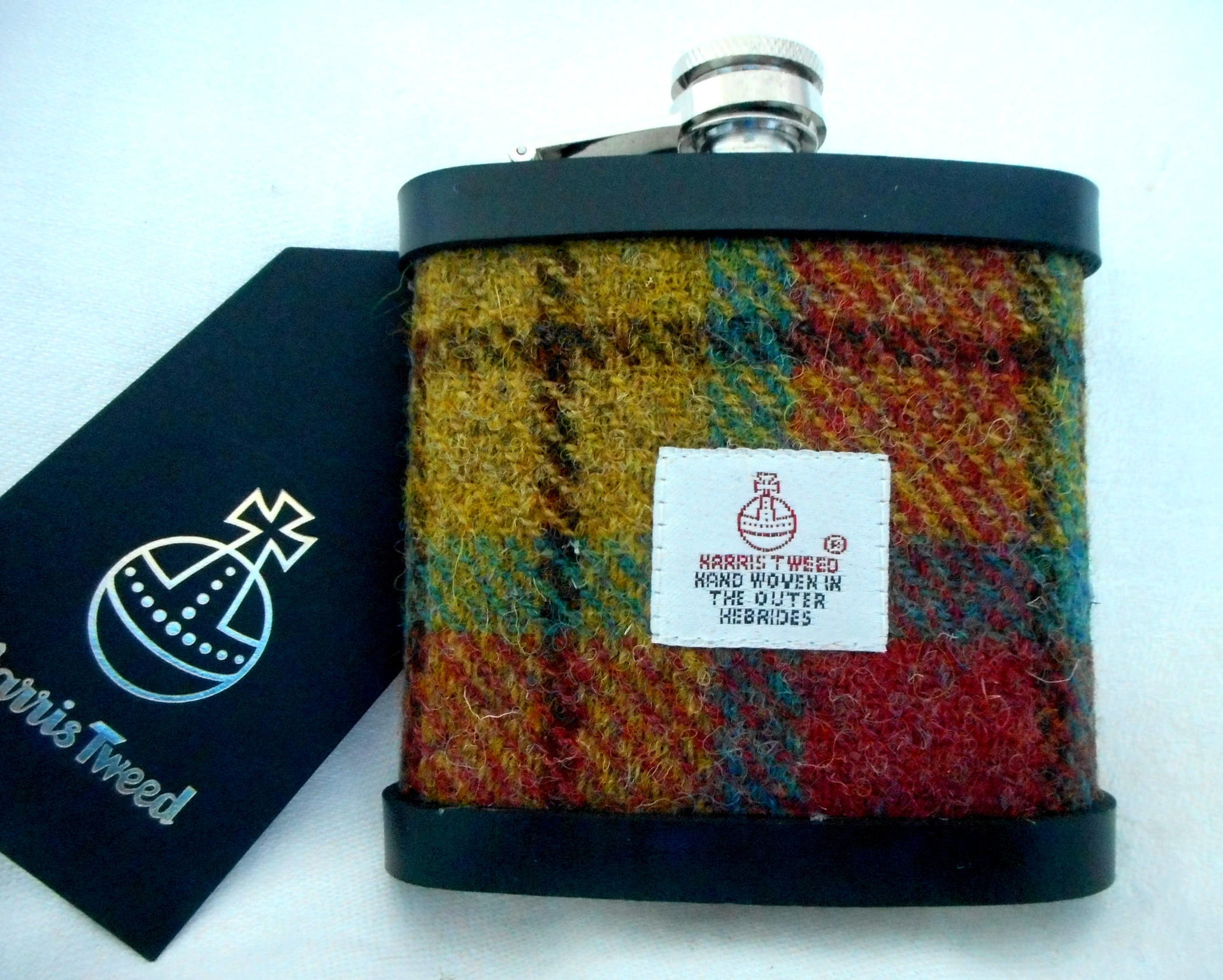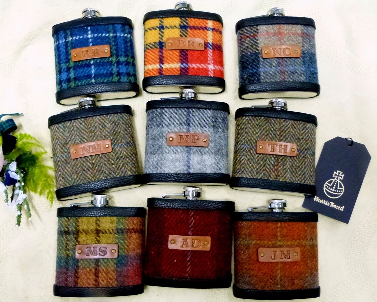 Harris Tweed hip flask in the colours of the Ancient Weathered Buchanan Tartan. mens gift made in Scotland retirement gift for best man groomsman birthday Christmas