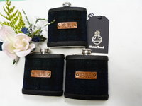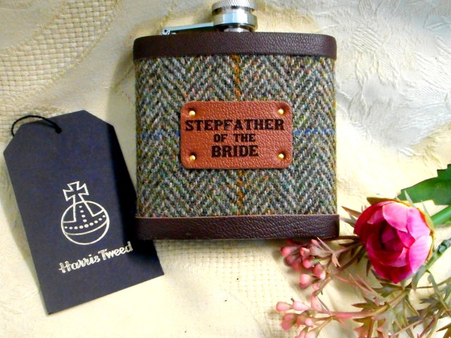 These Harris Tweed hip flasks with custom initials embossed on brown or black leather labels make superb groomsmens gifts
