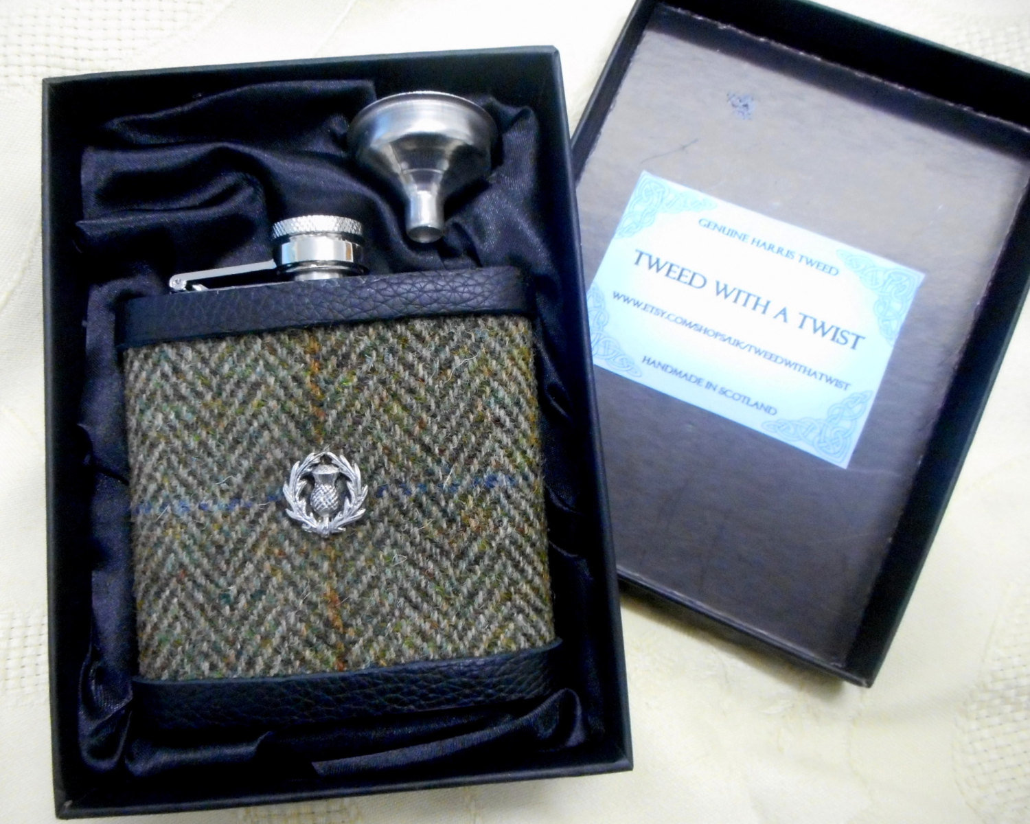 This beautiful hip flask features a luxurious Harris Tweed cover in a lovely olive green herringbone tweed with russet and blue subtle overchecks. The tweed cover is trimmed with real leather, and set with a highly detailed hand- cast pewter Scottish thistle,and on the back you will find the all important Orb label, assuring that this is indeed genuine Harris Tweed. There is also a Harris Tweed black swing tag as shown.